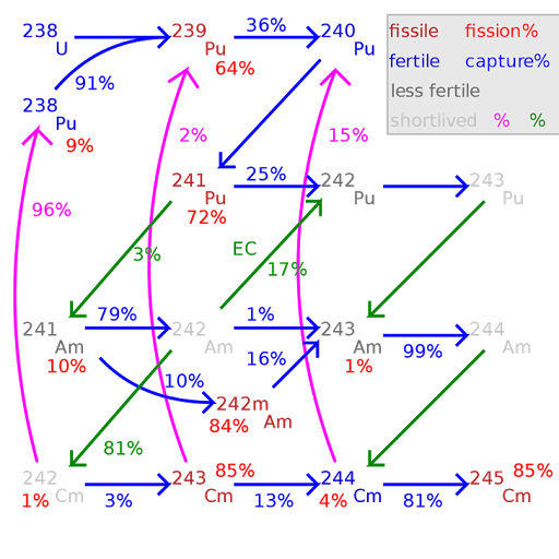鈽(Plutonium)作為核武材料是人儘皆知的,有何古怪之處?最常用作核武原料的,有鈾和鈽沒錯,可是那主要是鈾233、鈾235和鈽239。是因為鈽241無法核裂變嗎?其實不是,鈽241理論上是可以像鈽239那樣核裂變而成為核武和核能燃料的,可是使用鈽241有兩大問題,一是鈽241是人工製造的而非天然存在的,二是鈽241的半衰期只有14年,也就是說,14年後,有一半的鈽241就會衰變成不能核分裂的鎇241(Americium-241),核彈要放多久才會派上用場很難說,怎麼可能用半衰期這麼短的鈽同位素呢?