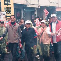 圖說:圖為立委黃偉哲倒數三天,在市議員林志展陪同下冒雨掃街拜票,並且呼籲青年返鄉投票掌握自己未來。(記者邱仁武攝)