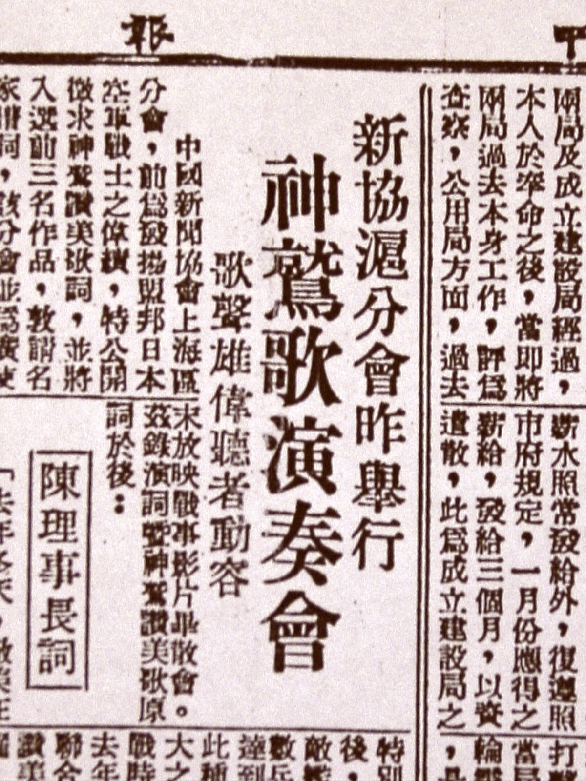 一九四五年三月五日下午五時,上海外灘華懋飯店(今和平飯店)賓客熙攘。鎂光燈前,那位「倀傳媒」(指六十年前抗日時期淪陷區的報紙)《申報》總編輯陳彬龢出現了。他宣佈,「去年冬天,敵美在太平洋蠢動以來,盟邦陸軍航空部隊,以一人一機一艦主義,組織神風特別攻擊隊」,鑒於此種神風精神,有宣傳廣大之必要,有在後方各種工作上推動之必要,去年十二月特公開徵求「神鷲讚美歌詞」,應徵者非常踴躍……當天舉行的,正是應徵歌曲的音樂會。