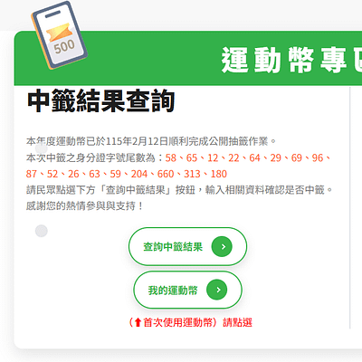 2026運動幣抽籤結果查詢【動滋網https://500.gov.tw/】