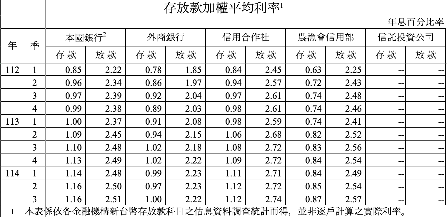 從利率面來看,資金環境同樣沒有鬆動的跡象。本國銀行放款加權平均利率自 112 年第 1 季的 2.22%,一路墊高至 114 年第 3 季的 2.51%,呈現緩步上行趨勢;即使央行僅能決定政策基準利率,銀行實際放款利率仍持續往上調整。這代表什麼?代表在經濟動能仍強、企業資金需求不弱的情況下,銀行根本沒有壓低利率的壓力。同時,存款利率雖然也有上升,但幅度相對溫和,利差結構仍維持在有利銀行獲利的位置。