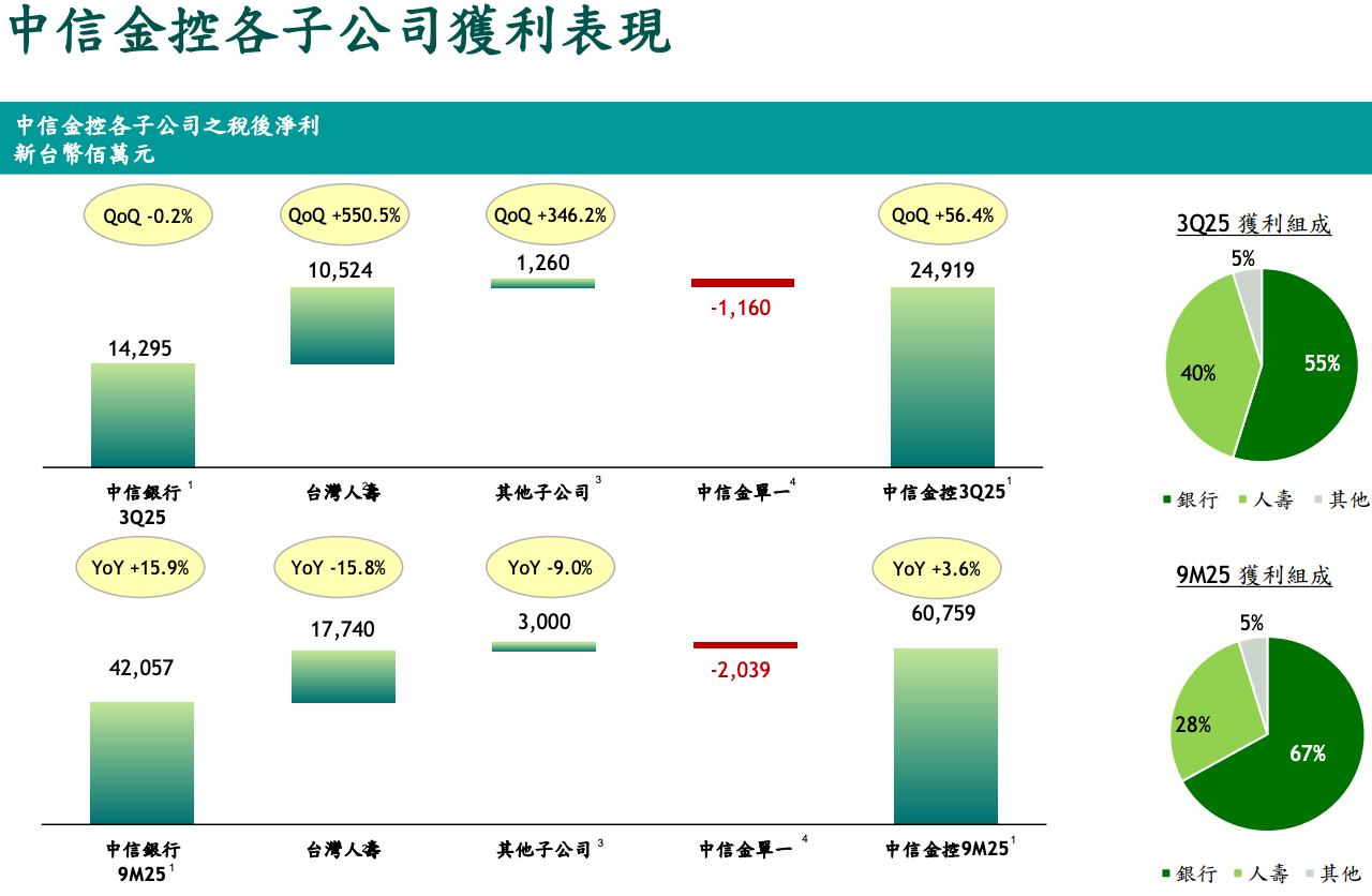 回到中信金的金控層面,從這張子公司獲利結構來看,中信銀行2025年前三季稅後淨利來到420.57億元,年增15.9%,佔整體金控獲利比重高達67%,另外還有台灣人壽,也難怪無敵了,近期股價屢創新高,這並不是市場情緒突然改變,而是財報數字一步一步推上來的結果,甚至是法人認錯,所以反手跪著崇拜買回,當規模優勢遇上景氣順風,強者當然只會更強。