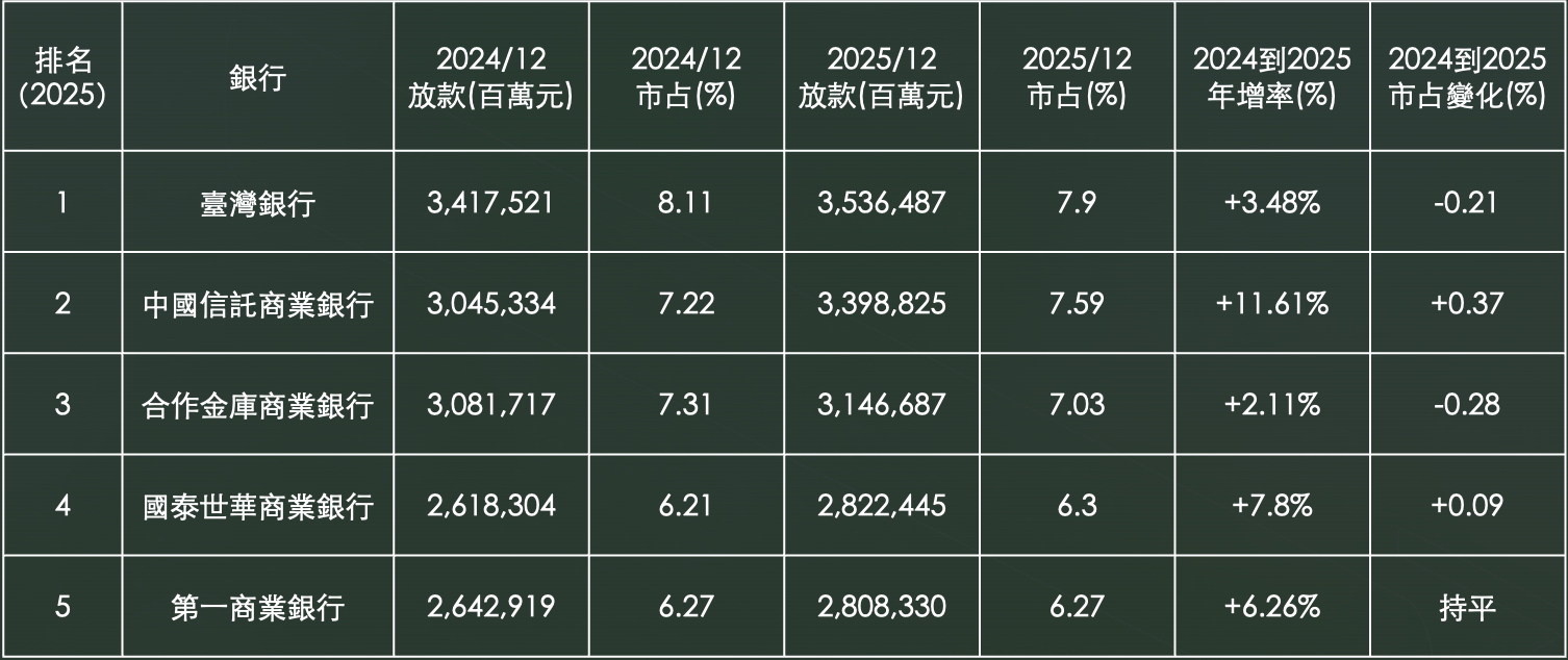 當整體資金水位持續創高、放款利率穩步上行,銀行之間真正的差別,就只剩一件事:誰的份額最大。從2025年底數據來看,前五大銀行放款規模全數突破2.8兆元以上,其中臺灣銀行3.54兆元、中國信託3.4兆元、合庫3.15兆元,市占率分別約7%到8%區間。這代表在44兆元以上的整體放款市場裡,光是前五大就掌握超過三成份額。